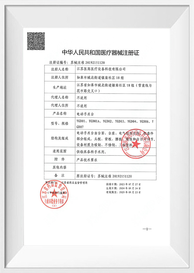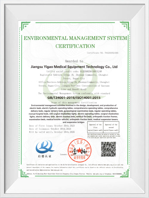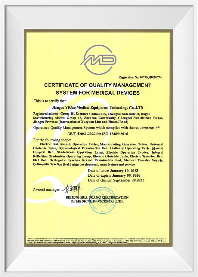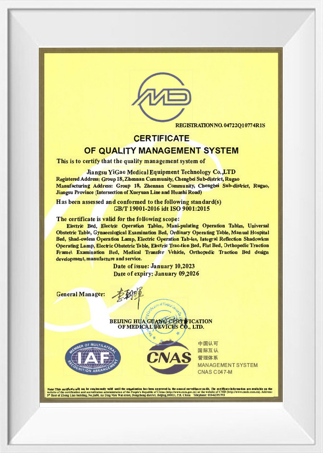 Como uma empresa que passou ISO 9001, ISO 13485, ISO 14001, ISO 45001 e outras certificações de sistema de gestão, Tecnologia de equipamentos médicos Jiangsu Yigao Co., Ltd. considera a qualidade do produto como sua força vital. Nossas mesas cirúrgicas cumprem rigorosamente Padrões CE , o que significa que não só cumprem os requisitos de segurança, saúde e ambientais do mercado europeu, mas também representam o nível de liderança internacional em design e fabrico de produtos.