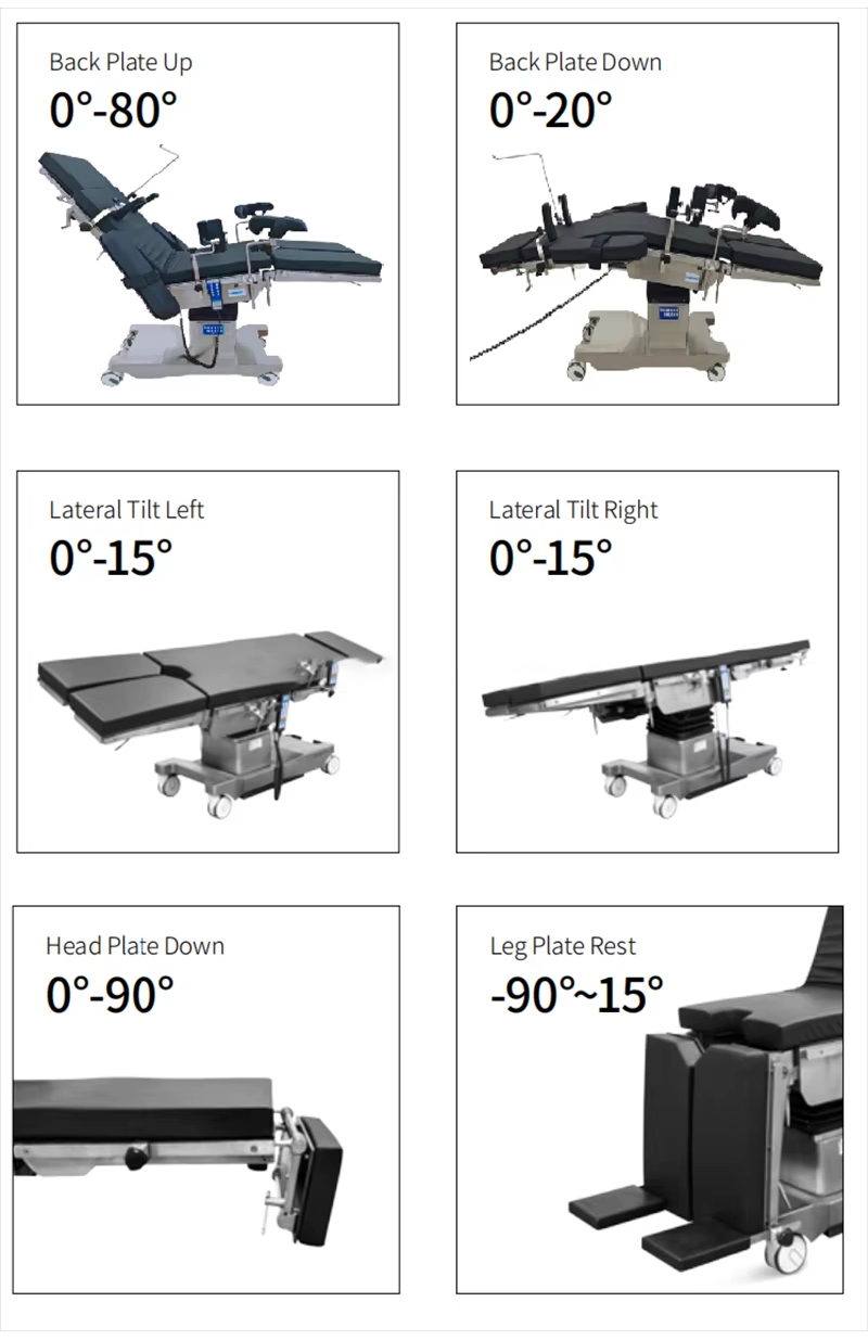 A mesa é dividida em quatro seções: cabeça, costas (incluindo a ponte da cintura), quadril e perna. O tampo da mesa é feito de material compósito de alta resistência com transmissão de raios X; Pode ser cooperado com um braço em C para tirar fotos.