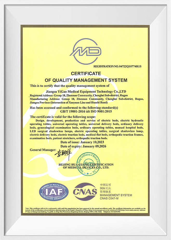 Como uma empresa que passou ISO 9001, ISO 13485, ISO 14001, ISO 45001 e outras certificações de sistema de gestão, Tecnologia de equipamentos médicos Jiangsu Yigao Co., Ltd. considera a qualidade do produto como sua força vital. Nossas mesas cirúrgicas cumprem rigorosamente Padrões CE , o que significa que não só cumprem os requisitos de segurança, saúde e ambientais do mercado europeu, mas também representam o nível de liderança internacional em design e fabrico de produtos.